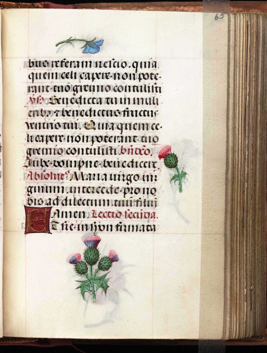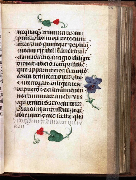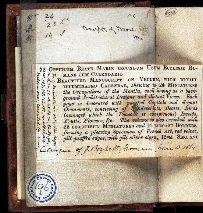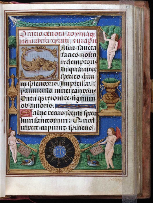 NomHoræ secúndum usum románum. Orig. Bruges vel Gent, finis XV s. Loc. Yale University (USA), Beinecke MS 287. Nomen breve : Horæ Beinecke MS 287. Petite noticeHeures à l’usage de Rome, le texte et les images ont été composés à Bruges ou Gant à la fin du XVe siècle. Le manuscrit est conservé par la Yale University, une université privée du Connecticut (USA). Il est composé de deux volumes. Le premier volume (MS 287) contient des pages originales du livre. Le second volume (MS 287A) contient des fac simile d’images qui ont été dans le livre original mais qui sont aujourd’hui perdues. Les fac simile ont été composé par Wing, C. W. (Charles William), entre 1846 et 64. LiensNotice détaillée : http://brbl-net.library.yale.edu/pre1600ms/docs/pre1600.ms287.htm Beinecke MS 287 et MS 287A Beinecke MS 287 : http://brbl-dl.library.yale.edu/vufind/Record/3433117 Beinecke MS 287A : |