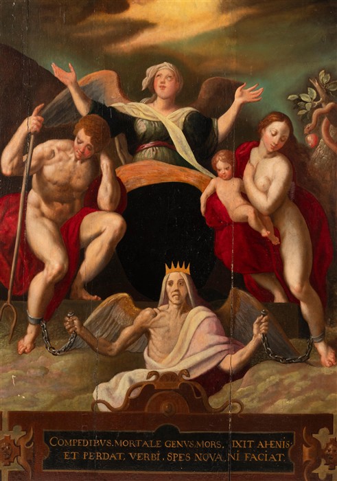 Jacob de Backer (Antwerpen, c. 1545 - Ibid., 1585), Fides spem præbet viris morte inclúsis FR La foi donne l’espoir aux hommes prisonniers de la mort, coll. priv. invaluable.com. Oil on oak, 106×76 cm. Adtribútio ab invaluable.com facta. |