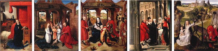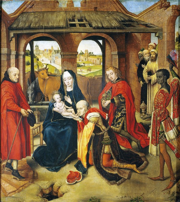 Pictor Adoratiónis Magórum Prado servátæ (flóruit Batávia, tértio quarto XV s.), Magórum adorátio ES La Adoración de los Magos, Madrid, Museo del Prado, Inv. P01558. Oleo in tábula, 59,5×54,6 cm. |