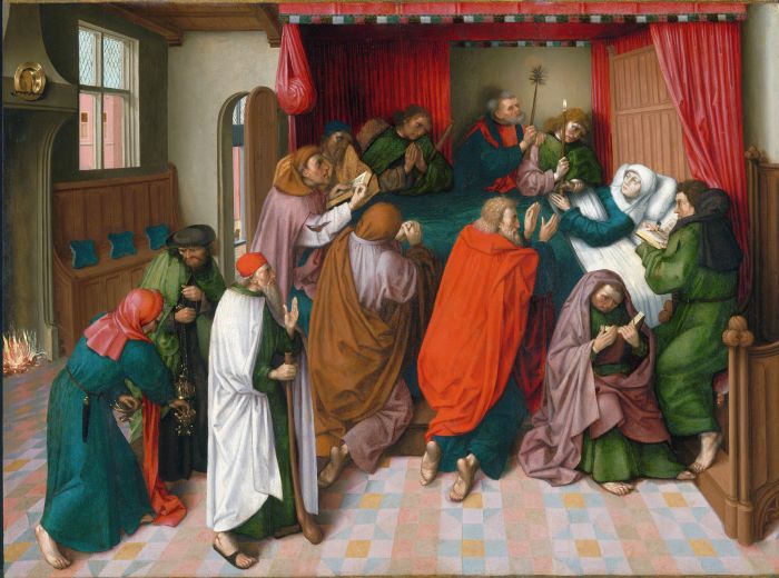 | Pictor Mortis Vírginis Amstelodámi, NL Meester van de Amsterdamse Dood van Maria (Batávia Septentrionális), Mors Vírginis NL Het sterfbed van Maria, c. 1500, Amsterdam, Rijksmuseum, Inv. SK-A-3467. Oleo in týmpano, 56,6×76,8 cm (superfícies picta). |