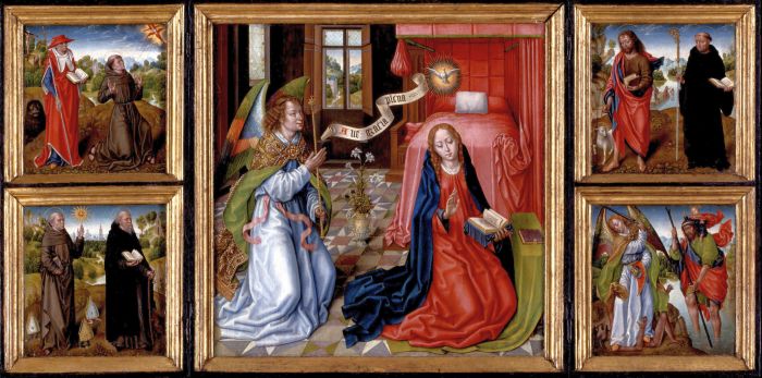 Pictor S. Ursulæ legendórum (Flandria, 1440-1540), Tríptycha ab annuntiatióne EN Triptych of the Annunciation, c. 1483, Indianapolis, Museum of Art (IMA) at Newfields, Inv. 1997.138. Oleo in týmpano, 23-1/4×45-3/4 in. |