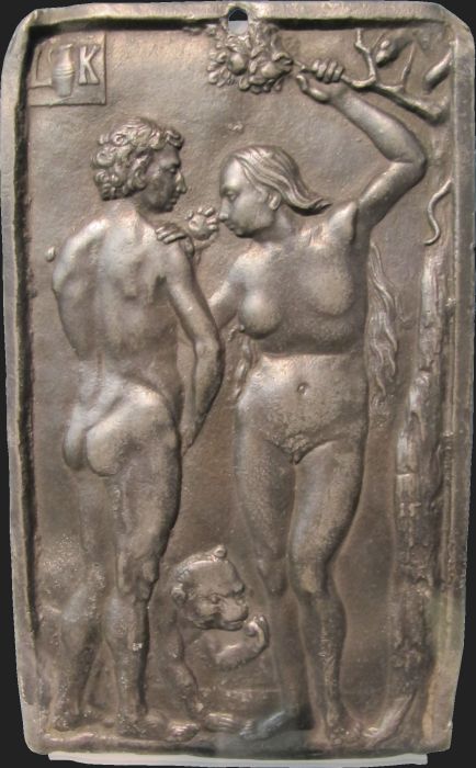 Ludwig Krug (Germánia, agens Nürnberg, 1488 – 1532), Lapsus Adæ et Evæ DE Der Sündenfall, Nürnberg, Germanisches Nationalmuseum, Inv. Pl.O.2392. plumbum, 14,4×8,8 cm. |