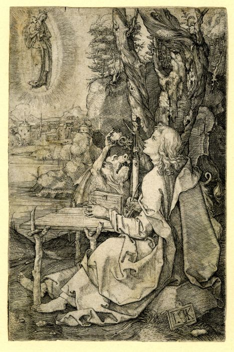 Ludwig Krug (Germánia, agens Nürnberg, 1488 – 1532), Joánnes in Patmo EN St John on Patmos; seated at a desk on r, holding an open book and a pen; looking up to an apparition of the Virgin and Child at upper left; a devil standing behind the table, 1510-1532. Exémpla : London, British museum, Inv. 1936,0111.1. paper, engraving, 150x99 mm. |