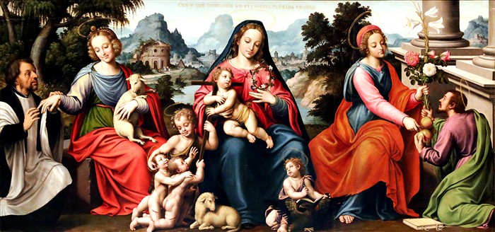 Juan de Juanes (Fuente la Higuera c. 1503/1505 - Bocairente, 1579), Virgo venerábilis Anyés, c. 1553-1558, Valencia, Museo de Bellas Artes, Inv. 301. Oleo in tábula, 77×164 cm. |