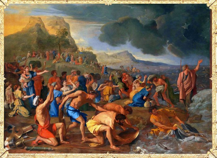 Nicolas Poussin (1594–1665), Tránsitus maris rubri EN The Crossing of the Red Sea, 1633-1637, London, National Gallery of Victoria, Inv. 1843-4. Oleo in tela, 154×210 cm.
