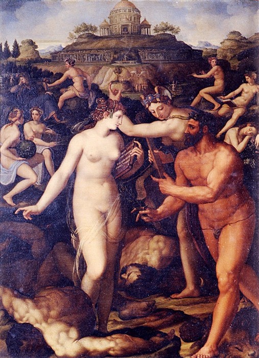 Alessandro Allori (Firenze, 1535 – Ibid. 1607), Ercole coronato dalle Muse, 1568, Firenze, Uffizi, Inv. 1890 n.1544. Olio su rame, 40×29,5 cm. |