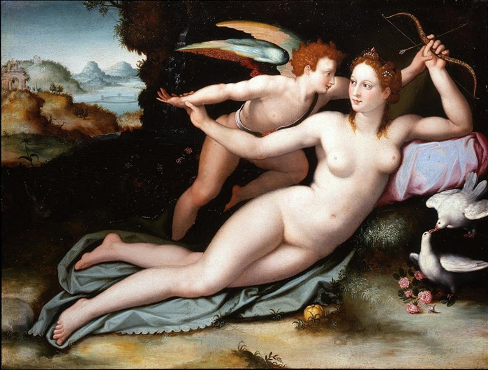 Alessandro Allori, adtribútio (Firenze, 1535 – Ibid. 1607), Venere e Cupido, c. 1570, Firenze, Uffizi, Inv. 1890 n. 1512. Oleo in týmpano, 29×38,5 cm. |