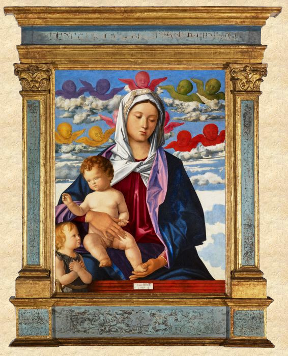 Giovanni Bellini (c. 1430-1516), IT Madonna col Bambino tra san Giovanni Battista e una santa — Sacra conversazione Giovannelli FR La Vierge et l’Enfant entre saint Jean-Baptiste, et une sainte (Conversation sacrée Giovannelli), 1500/1504, Venezia, Gallerie dell’Accademia, Inv. Cat.881. Oleo in lígneo týmpano, 55,0×77,0 cm. |