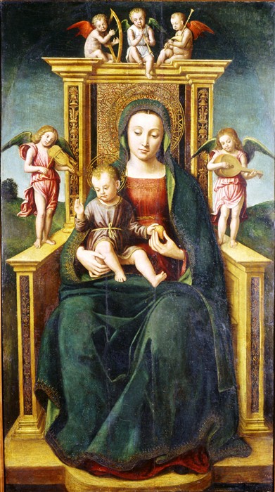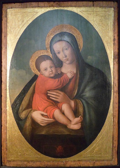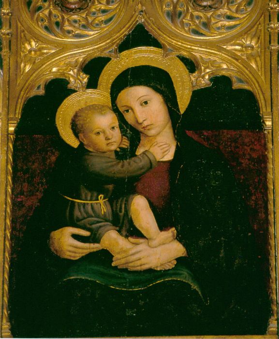 Ludovico Brea (Nissa, c. 1450 - c. 1522-1525), Virgo cum infánte in throno sedens, 1490, Milano, Museo Poldi Pezzoli, Inv. 5239. 110×70 mm. Google. |