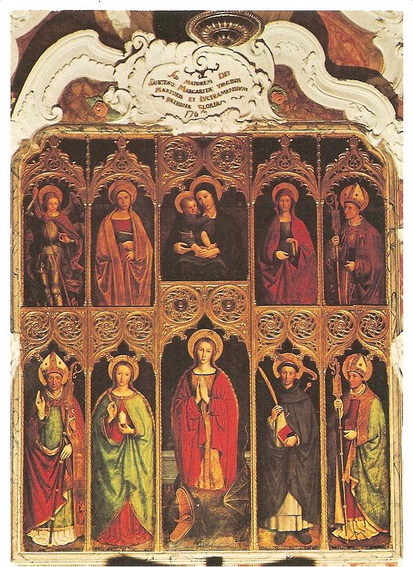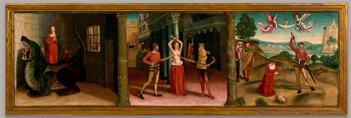 Ludovico Brea (Nissa, c. 1450 - c. 1522-1525), Prædélla retábuli Sanctæ Margarítæ Antiochénæ (síngula res), 1498-1500, Nice, musée des Beaux-Arts Jules Chéret, Inv. N.Mba 255. Oleo et tempera in týmpano, 46,5×160,5 cm. |