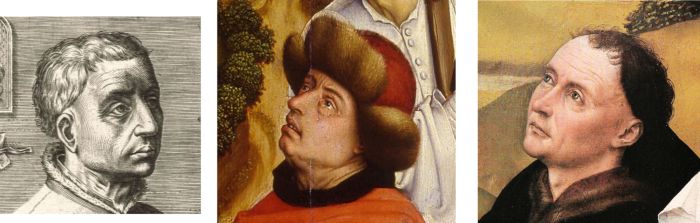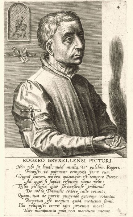 Effígies Rogier van der Weyden attribúta ad Johannes (Jan) Wierix, incísio, in Domínicus Lampsonius, Pictórum áliquot Germániæ Inferióris Effigies, 1572. — Liber (Courtauld). |