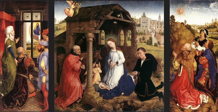 Tríptycha Nativitátis « Tríptycha Bladelin » DE Middelburger-Altar / Bladelin-Altar, c. 1445-1448, Berlin, Staatliche Museen, Inv. Nr. 535. quérceas tábulas, 93,5×92 cm (médiam tábulam), 93,5×41,8 cm (læva valva), 93,5×41,4 cm (déxtera tábula). Clausa : Annuntiátio. Læva valva : Sibylla Tiburtína Vírginis cum infánte apparitiónem Augusto imperatore osténdit. — Apérta : Média tábula : Natívitas cum Pieter Bladelin. — Dextra valva : Infántis Jesu apparítio Régibus magis. |