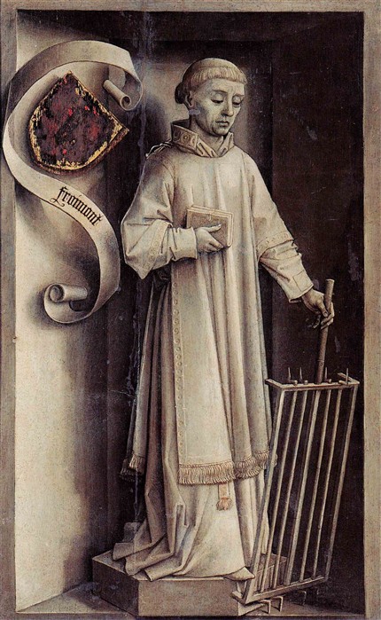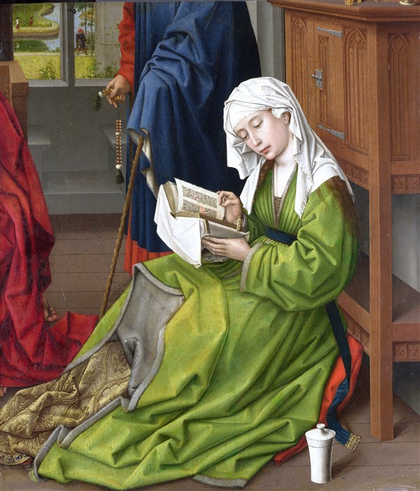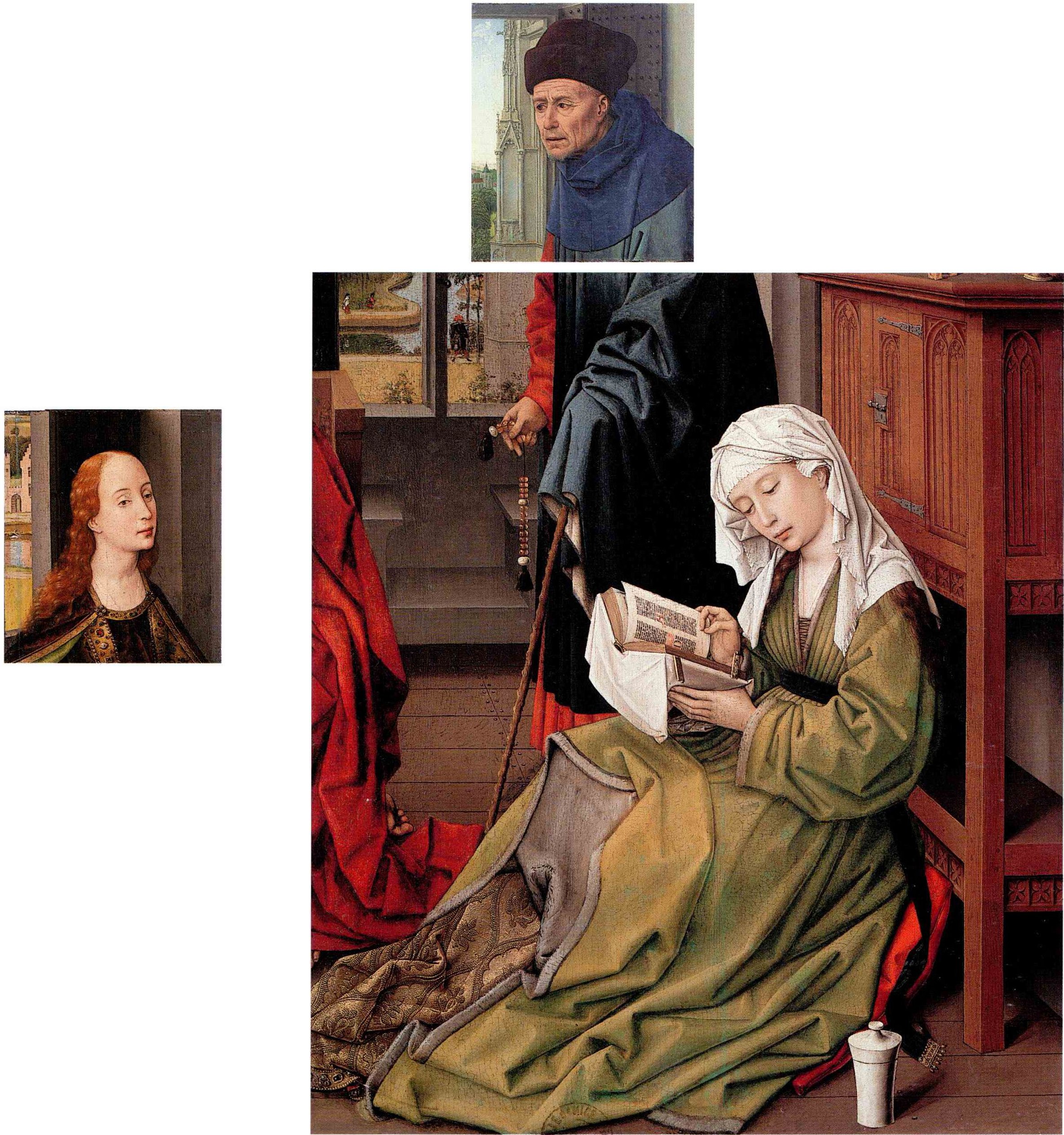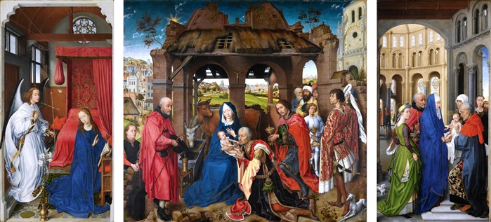 Rogier van der Weyden (Tournai, 1399/1400 – Bruxelles, 1464), Tríptycha Annuntiatiónis FR Triptyque de l’Annonciation, parum post 1434. — Média tábula : Paris, Musée du Louvre, Inv. 1982 ; MR 813. — Exterióres tábulæ : Torino, Galleria Sabauda, Inv. 32 - Galleria Sabauda / 28 - Galleria Sabauda. — Quérceis tábulis, 87×91,5 cm (média tábula), 89,7×36, 5 cm (exterióres tábulæ). |