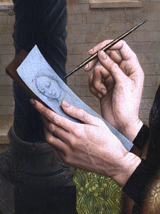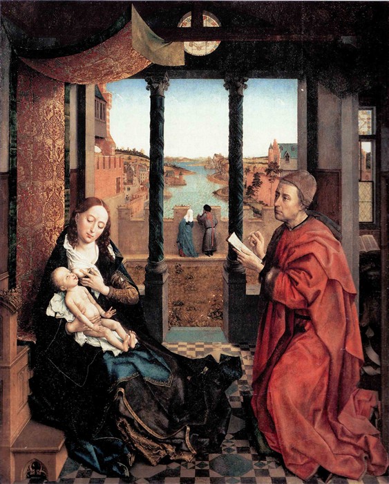 Rogier van der Weyden (Tournai, 1399/1400 – Bruxelles, 1464), Sanctus Lucas délinens Vírginis cum infánte effígiem « Virgo Sancti Lucæ » FR. Saint Luc dessinant le portrait de la Vierge à l’Enfant, c. 1435-1440, Boston, Museum of Fine Arts, Inv. 93.153. Quércea tábula, 137,7×110,8 cm. |
