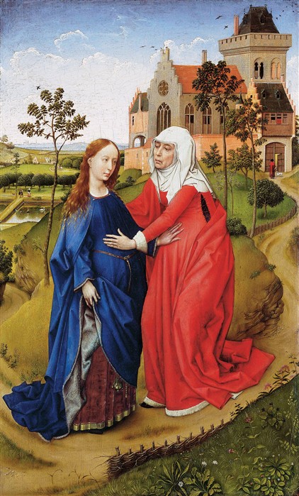 Rogier van der Weyden (Tournai, 1399/1400 – Bruxelles, 1464), Visitátio, c. 1435-1440, Leipzig, Museum der bildenden Künste, Inv. 550. Quércea tábula, 57, 8×36,2 cm. |