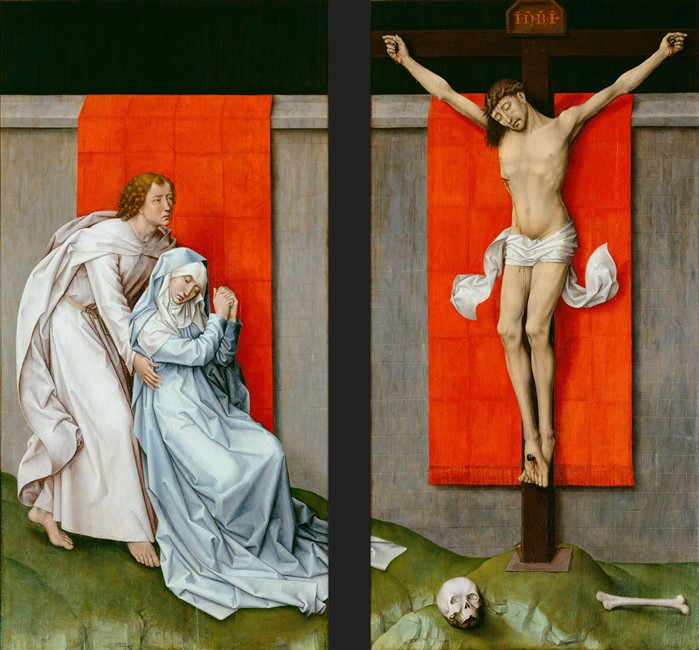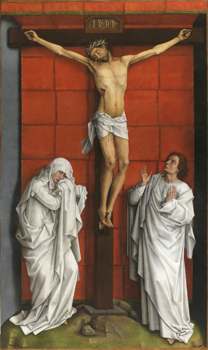 Rogier van der Weyden (Tournai, 1399/1400 – Bruxelles, 1464), Christus in cruce inter Vírginem et Sanctum Joánnem « Crucifíxio Scheut », c. 1457-64, El Escorial, Real Monasterio de San Lorenzo, Inv. nr. 10014602. Quérceo, 325×192 cm. |