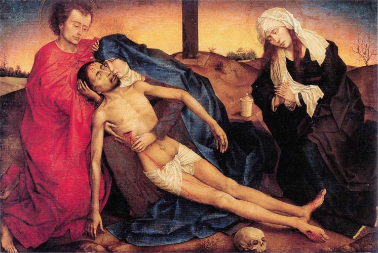 Rogier van der Weyden (Tournai, 1399/1400 – Bruxelles, 1464), Deplorátio ante sepúlcrum apértum IT Deposizione di Cristo nel sepolcro, c. 1463-1464, Firenze, Galleria degli Uffizi, Inv. 1890, n. 1114. Quércea tábula, 110×96. |