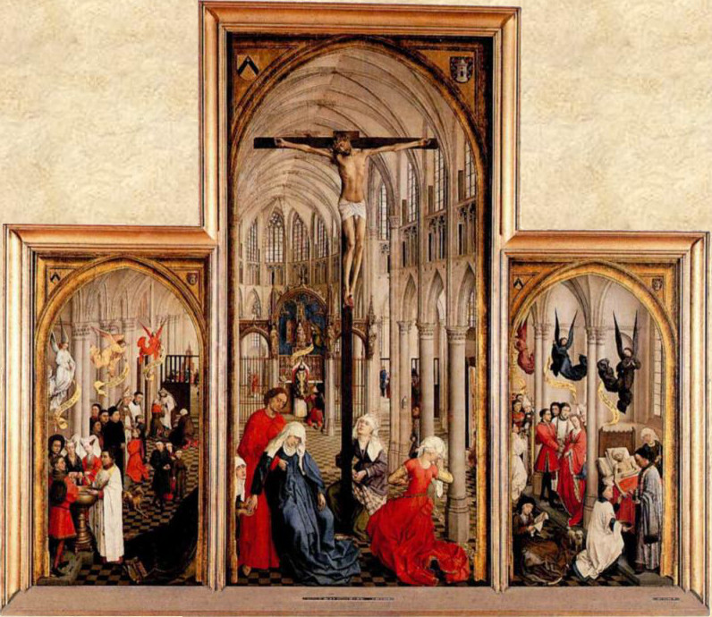 Rogier van der Weyden (Tournai, 1399/1400 – Bruxelles, 1464), Tríptycha septem Sacramentórum, « Retable Chevrot », c. 1440-1445, Antwerpen, Koninklijk Museum voor Schone Kunsten, Inv. 393-395. Quérceis tábulis, 200×97 cm (média tábula), 119×63 cm (exterióres tábula). |