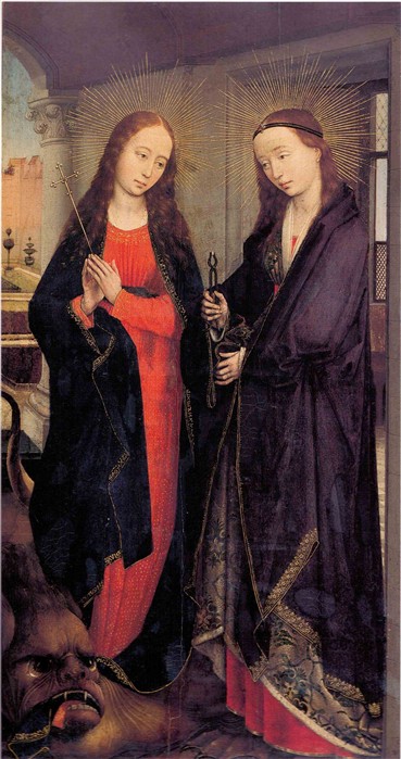 Rogier van der Weyden (Tournai, 1399/1400 – Bruxelles, 1464), Sanctæ Margarita et Apollonia, c. 1445-1455, Berlin, Staatliche Museen zu Berlin, Inv. nr. 534C. Quércea tábula, 51,5×27,5 cm. |