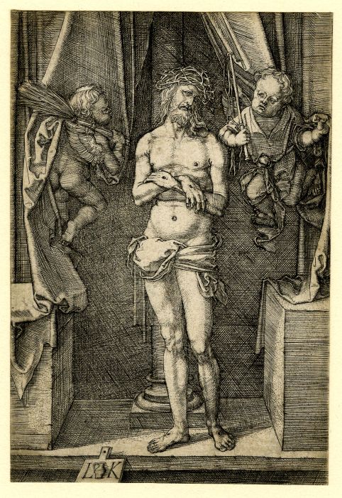Ludwig Krug (1488-1532), Imago pietátis inter Maríam et Joánnem EN Christ as the Man of Sorrows with the Virgin and St John; inter 1510 et 1532, London, British Museum, Inv. 1929,0211.3. Cælatúra, 120x78 mm. |