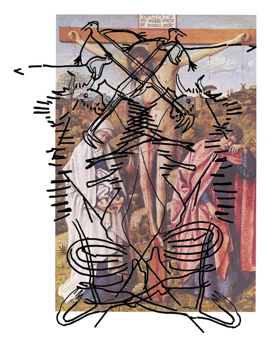 L’œil et la deuxième croix sont des idéogrammes. Une partie de chaque personnage est utilisée pour représenter le tout. Jan van Eyck nous propose encore une autre lecture : le bison est la Vierge Marie, l’homme-oiseau est Saint Jean et l’oiseau sur un piquet est le Seigneur Jésus. Il y a en effet deux récits simultanés dans la Passion de notre Seigneur Jésus-Christ : |