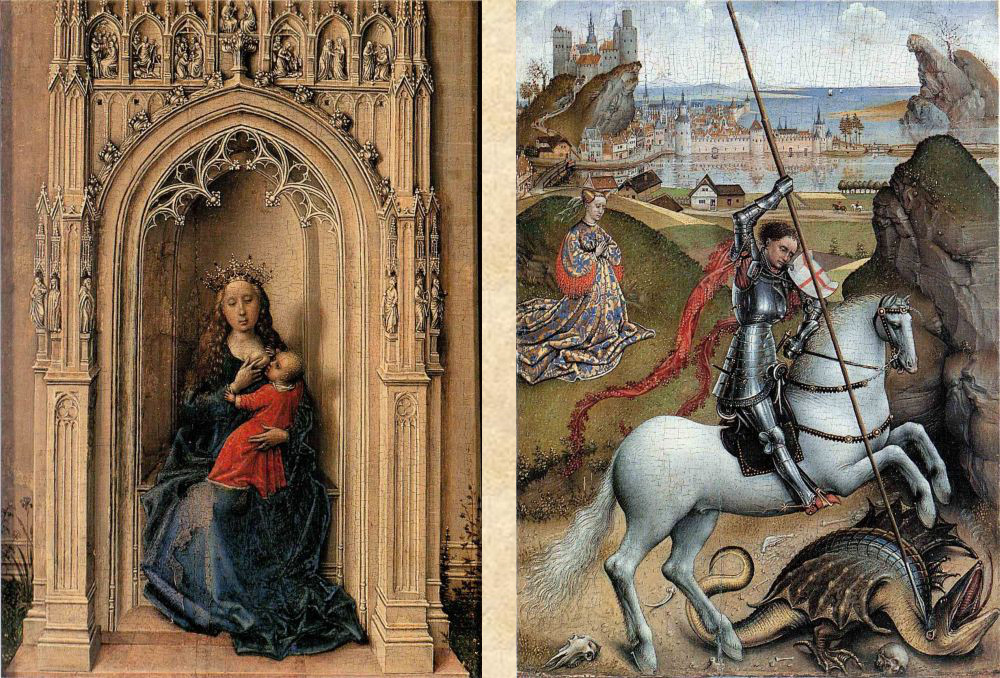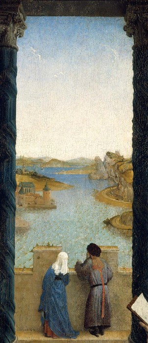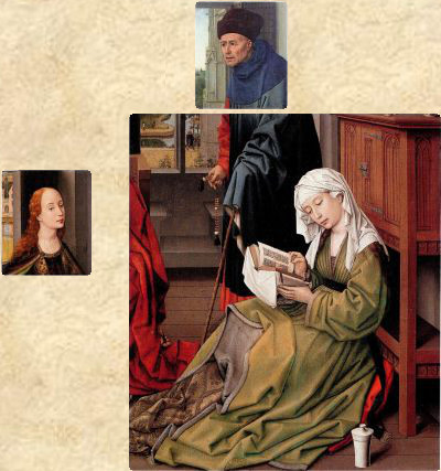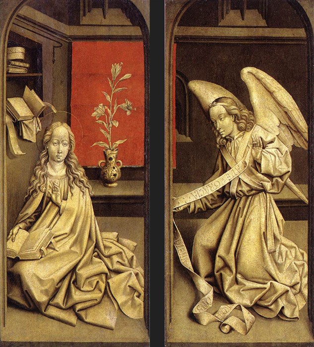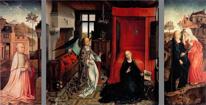 Rogier van der Weyden (Tournai, 1399/1400 – Bruxelles, 1464), Tríptycha Annuntiatiónis FR Triptyque de l’Annonciation, parum post 1434. — Média tábula : Paris, Musée du Louvre, Inv. 1982 ; MR 813. — Exterióres tábulæ : Torino, Galleria Sabauda, Inv. 32 - Galleria Sabauda / 28 - Galleria Sabauda. — Quérceis tábulis, 87×91,5 cm (média tábula), 89,7×36, 5 cm (exterióres tábulæ). |