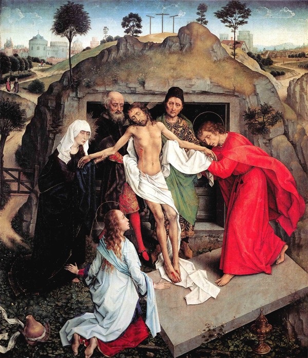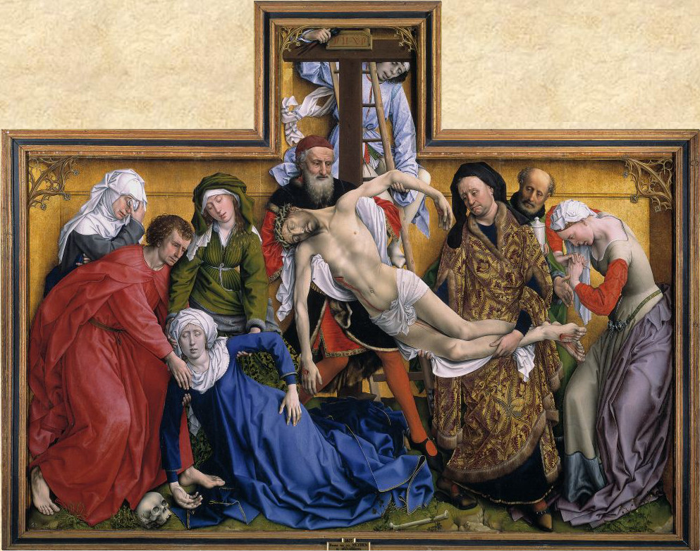 Rogier van der Weyden (Tournai, 1399/1400 – Bruxelles, 1464), Deplorátio ante sepúlcrum apértum IT Deposizione di Cristo nel sepolcro, c. 1463-1464, Firenze, Galleria degli Uffizi, Inv. 1890, n. 1114. Quércea tábula, 110×96. |