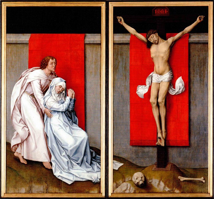 Rogier van der Weyden (Tournai, 1399/1400 – Bruxelles, 1464), Christus in cruce inter Vírginem et Sanctum Joánnem « Crucifíxio Scheut », c. 1457-64, El Escorial, Real Monasterio de San Lorenzo, Inv. nr. 10014602. Quérceo, 325×192 cm. |