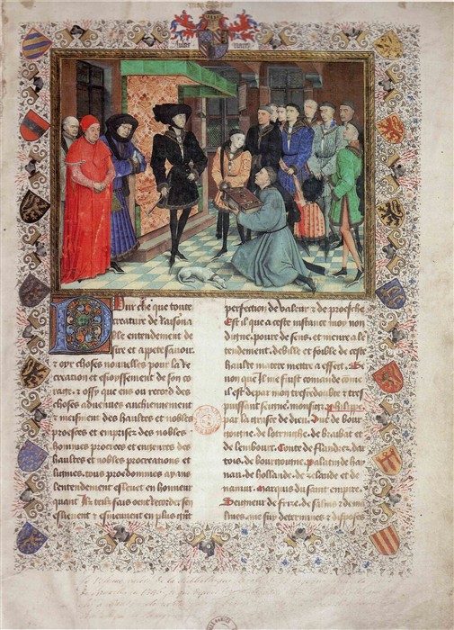 Rogier van der Weyden (Tournai, 1399/1400 – Bruxelles, 1464), Jean Wauquelin sua Hainaut Chrónica Philíppo III Bourgoniénsi præbet, Miniatúra dedicatória FR. Jean Wauquelin remet ses Chroniques de Hainaut à Philippe III de Bourgogne, Miniature dédicatoire, c. 1447, Bruxelles, Bibliothèque royale, ms. 9242, fol. 1. Velaménto, 42,3×28,8 cm (fólium), 15,4×20 cm (illuminátio). |