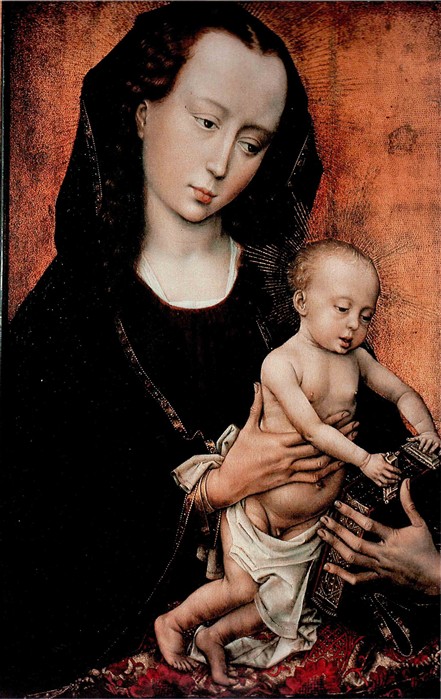 Rogier van der Weyden (Tournai, 1399/1400 – Bruxelles, 1464), Vírginis ósculum infánti FR. Baiser de la Vierge à l’Enfant, c. 1461-1462, Houston, Museum of fine arts, Inv. 44.535. Quércea tábula, 31,8×22,5 cm. |