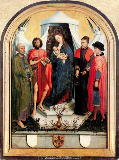 Rogier van der Weyden (Tournai, 1399/1400 – Bruxelles, 1464), Virgo circúmdata a quatuor Sanctis « Madonna Medici », c. 1460-1464, Francfort, Städelsches Kunstinstitut, Inv. 850. Quércea tábula, 53,1×37,5 cm (ornaménti intérior), 61,7×46,1 cm (cum ornaménto). |