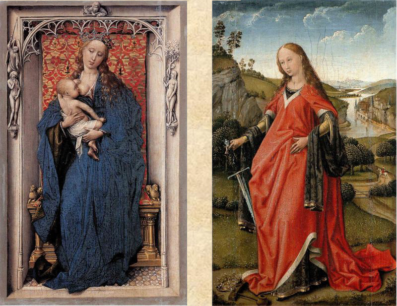 Rogier van der Weyden (Tournai, 1399/1400 – Bruxelles, 1464), Virgo recta lactans et Sancta Catharína in prospéctu FR. La Vierge Marie debout donnant le sein à l’Enfant Jésus. Sainte Catherine dans un paysage, c. 1430-1432, Wien, Kunsthistorisches Museum. Quérceas tábulas. — Læva tábula (Virgo) : Inv. Gemäldegalerie, 951, 18,9×12,2 cm. — Déxtera tábula (Sancta Catharína) : Inv. Gemäldegalerie, 955, 18,8×12,1 cm. |
